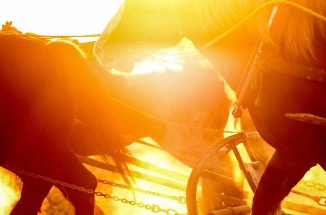 夕陽に照らされたサラブレッドが一斉に波打ち際をギャロップする様子は圧巻。