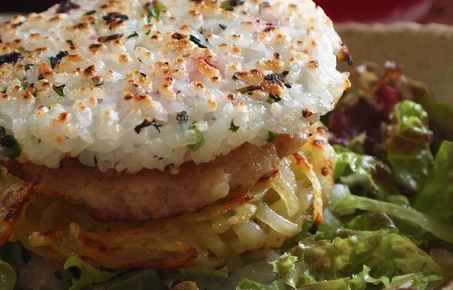 ライスサンドとは、ハンバーガーのバンズの代わりに米飯を圧縮し、具材を挟んだ料理のこと。
